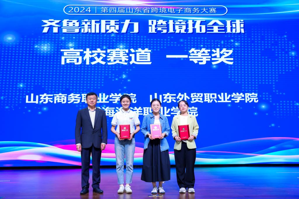 山东省商务厅对外贸易处处长马翎,烟台市总工会党组书记、常务副主席陈海涛,山东省跨境电商产教联盟理事长、Beat365官网原院长刁建东,山东省对外经济贸易工会主席田敬毅,以及阿里巴巴国际站北方大区总经理郭建民共同出席大赛颁奖仪式。