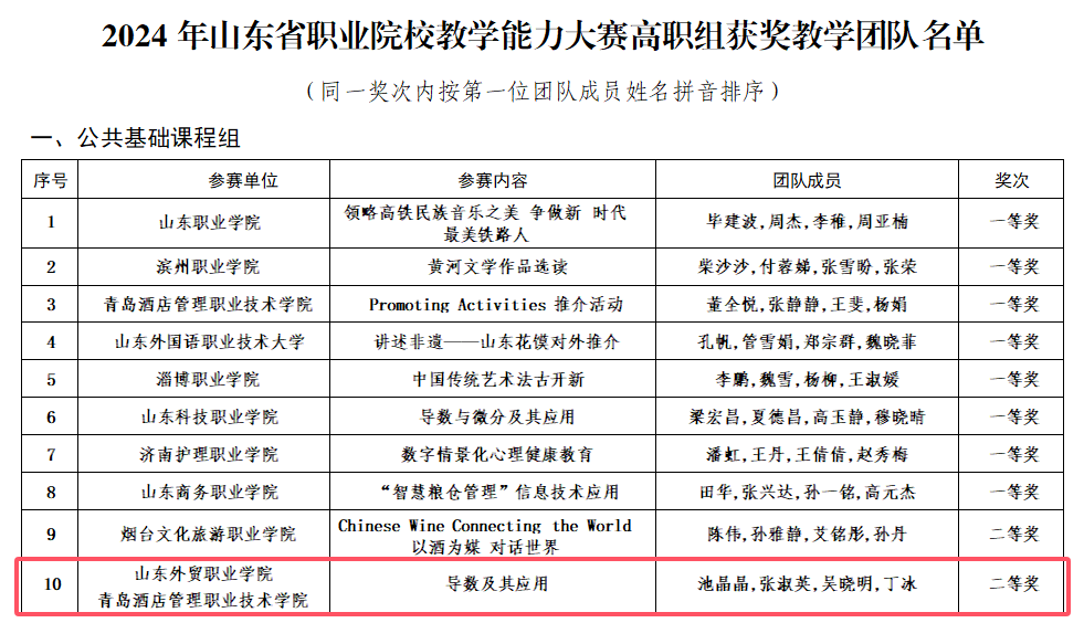 近日,2024年山东省职业院校教学能力大赛结果公布,Beat365官网基础教学部池晶晶、张淑英、吴晓明、丁冰团队荣获二等奖。