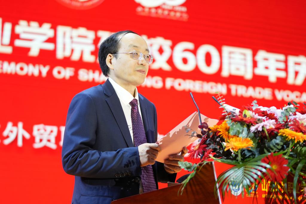 张庆伟在讲话中指出,学院建校60周年以来,在外贸、外语、外运、跨境电商、援外培训等领域取得了显著成绩,为国家培养了七万五千多名优秀外经贸人才,为144个发展中国家培训了一万两千多名官员和技术人员。当前,全省上下正深入学习贯彻党的二十届三中全会精神和习近平总书记视察山东重要讲话精神,希望学院以建校六十周年为新起点,认真贯彻习近平总书记关于教育强国、贸易强国系列重要论述,全面贯彻党的教育方针,落实立德树人根本任务,坚持特色办学,牢记“国之大者”,在全面建设社会主义现代化国家的伟大征程中,在推进中国式现代化山东实践中,在服务山东打造高水平对外开放新高地的具体行动中,展现新作为、作出新贡献。
