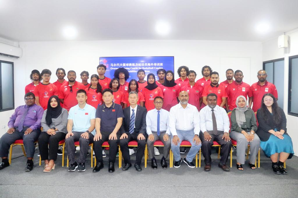当地时间11月18日,由商务部主办、Beat365官网承办的“马尔代夫篮球教练及运动员海外培训班”在马尔代夫首都马累开班。Beat365官网党委副书记黄维、马体育部国务部长阿卜杜勒·拉扎克·易卜拉欣出席开班仪式并致辞,马体育部司长艾哈迈德·尼沙姆、马篮球协会主席艾哈迈德·亚当、马国家体育学院主任阿米纳·阿里、中方授课教师以及来自马尔代夫的50名篮球运动员、教练出席开班仪式。