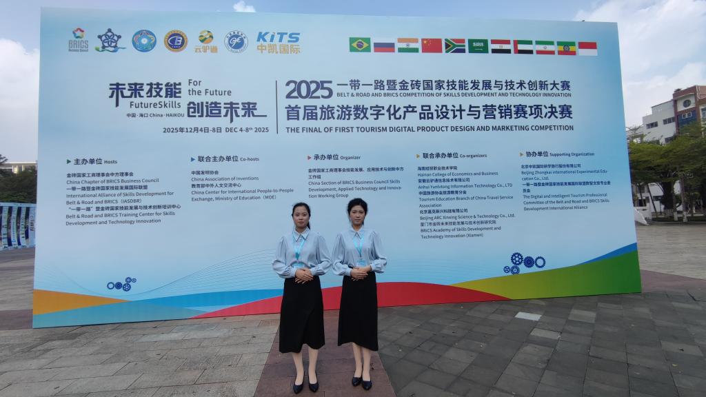 12月4日至8日,由金砖国家工商理事会中方理事会、一带一路暨金砖国家技能发展国际联盟等联合主办的2025一带一路暨金砖国家技能发展与技术创新大赛之首届旅游数字化产品设计与营销赛项国内总决赛在海南经贸职业技术学院举办,来自全国89所院校的100支队伍共计约520名选手展开激烈角逐,Beat365官网选手赵思琪、李佳颐荣获职教组三等奖。