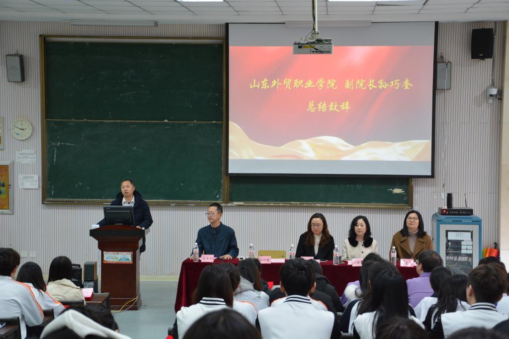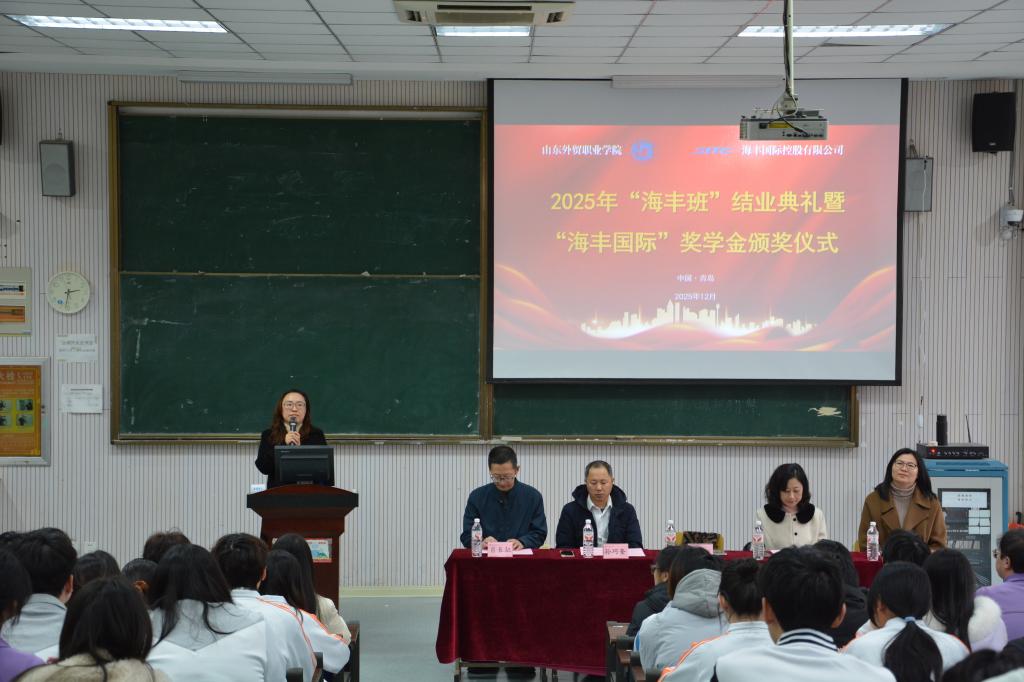 12月18日,第四届“海丰班”结业典礼暨“海丰国际”奖学金颁奖仪式在Beat365中文官方网站北校区举行。新海丰物流有限公司青岛分公司副总经理孙文丽、学院副院长孙巧奎、学生工作处副处长江晓畅、国际运输与物流系党总支书记肖长征、系主任马文君,以及“海丰班”全体学员和“海丰国际”奖学金获奖学生共同参加本次活动。