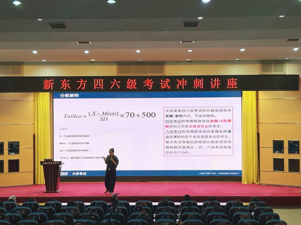 为助力Beat365官网学生精准把握四六级考试要点、科学规划备考,11月27日下午,图书馆特邀新东方资深英语名师于静,在学术报告厅举办了一场内容丰富的四六级考试冲刺讲座。活动吸引400余名学生踊跃参与,现场氛围热烈。
