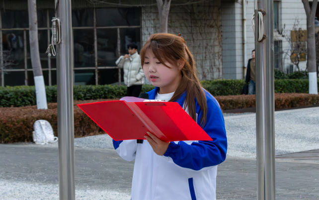 随后,学生代表迟添翼作题为“传承精神血脉,勇担时代使命”的国旗下演讲。她带领大家一起回顾了一二·九运动的光辉历史,号召全体同学“要铭记那段唤醒民族意识的峥嵘岁月,更要珍惜当今来之不易的发展环境。新时代青年应当继承先辈遗志,将精神传承转化为勤学实干、攻坚克难的具体行动,在科技创新、社会服务、文化传承中展现担当,让青春在为祖国、为人民、为民族的奉献中焕发绚丽光彩”。
